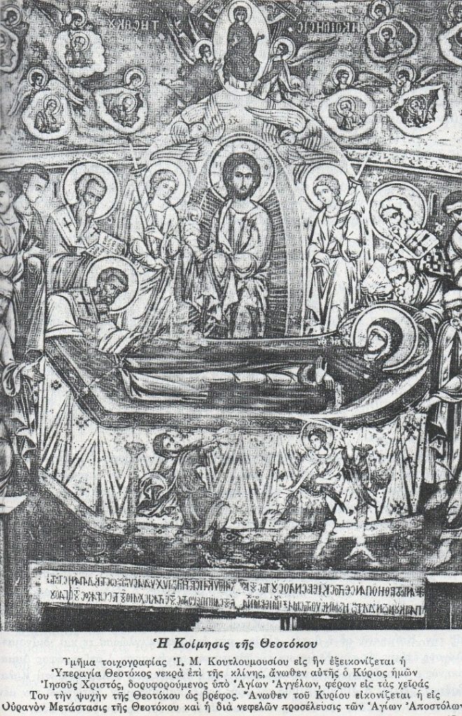 Ταῦτα εἶπεν ἡ Θεοτόκος εἰς τούς Ἀποστόλους, καί ἄλλα περισσότερα· παρευθύς δέ ἔκλεισε τούς ἁγίους αὐτῆς ὀφθαλμούς εἰποῦσα μεγάλῃ τῇ φωνῇ· «Υἱέ μου, εἰς χεῖράς σου παρατίθημι τό πνεῦμά μου»· καί ἐκοιμήθη. Ἐδέχθη δέ τήν ἁγίαν της ψυχήν ὁ Υἱός της εἰς τάς χεῖράς του. Ἐζήτησε τότε ἡ Παναγία ἀπό τόν Υἱόν της νά ὑπάγῃ εἰς τόν Ἅδην νά ἴδῃ τούς τόπους ὅπου ἐπῆγεν Ἐκεῖνος νά ἐλευθερώσῃ τούς Προπάτορας καί τήν εἰσήκουσεν. Ἄγγελοι δέ φωτεινοί ἐπῆραν τήν ἁγίαν της ψυχήν, καί τήν ὡδήγησαν ὅπου ἤθελε μόνη της ἡ ψυχή, ὡς μαρτυρεῖ τοῦτο ὁ Ἰωάννης ὁ Δαμασκηνός εἰς τό Τροπάριον τῆς τετάρτης ᾠδῆς σήμερον λέγων· «Θάμβος ἦν θεάσασθαι τόν οὐρανόν τοῦ παμβασιλέως τόν ἔμψυχον, τούς κενεῶνας ὑπερχόμενον τῆς γῆς»· ἤτοι θαῦμα καί ἔκπληξις ἦτο νά ἴδῃ τις τῆς Παναγίας τήν ψυχήν πῶς περιεπάτει εἰς τά κατώτατα τῆς γῆς, δηλαδή εἰς τόν Ἅδην. Καί ἡ μέν ψυχή της ἐπῆγεν εἰς τόν Ἅδην, ὡς τό ἐζήτησε, τό δέ ἅγιον καί θεοδόχον σῶμά της συνέστειλαν οἱ Μαθηταί, καί τό ἐπῆραν εἰς τούς ὤμους των, νά τό φέρουν εἰς τόν τάφον· καί ἀπό μέν τό ἕν μέρος ἐκράτει ὁ Θεολόγος Ἰωάννης, ἀπό δέ τό ἕτερον ὁ Πέτρος, ἀπό δέ τό τρίτον μέρος ἐκράτει ὁ Ἰάκωβος ὁ ἀδελφός τοῦ Ἰωάννου, ἀπό δέ τό τέταρτον ὁ Παῦλος, οἱ δέ λοιποί Ἀπόστολοι καί Ἀρχιερεῖς ἐπορεύοντο ψάλλοντες καί ὑμνοῦντες· οἱ φθονεροί δέ Ἰουδαῖοι ἀκούοντες τήν ὑμνῳδίαν τῶν Ἀγγέλων καί τῶν Ἀποστόλων καί βλέποντες τήν πολλήν παρρησίαν, ἐφθόνησαν· ποιήσαντες δέ βουλήν ἀπεφάσισαν νά ὑπάγουν νά κρημνίσουν τόν κράββατον τῆς Παναγίας μέ τό ἅγιον αὐτῆς καί παναμώμητον σῶμα.