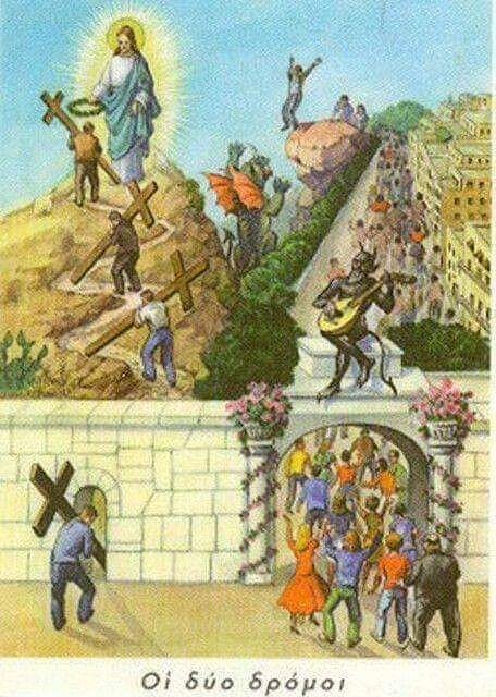 Πρός τόν Παράδεισον, περί τοῦ ὁποίου ὡμιλήσαμεν ἕως τώρα, δύο εἶναι αἱ ὁδοί, ἡ μία στενή καί τεθλιμμένη, καθώς λέγει ὁ Χριστός· «στενή· καί τεθλιμμένη ἡ ὁδός ἡ ἀπάγουσα εἰς τήν ζωήν» (Ματθ. ζ’ 14). Στενή· τόσοι Ἀσκηταί, οἵτινες τήν ἐπεριπάτησαν, ἄφησαν ὀπίσω ὅλον τόν κόσμον καί τά ἐγκόσμια καί ἐπέρασαν γυμνοί. Τόσοι Ἅγιοι Μάρτυρες, οἵτινες τήν ἐρράντισαν, ὄχι μέ τόν ἱδρῶτα, ἀλλά μέ αἷμα. Ἀλλ’ ἐκεῖνοι, οἵτινες περιπατοῦν μέ τήν κεφαλήν πολλά ὑψηλήν, ἄν δέν χαμηλώσωσιν ὀλίγον, ἐδῶ δέν χωροῦν, ἡ ὁδός εἶναι στενή. Ἐκεῖνοι οἱ ὁποῖοι ἔφαγον πολύ καί ἐπάχυναν, ἄν δέν λεπτύνουν τήν σάρκα των, ἐδῶ δέν χωροῦν, ἡ ὁδός εἶναι στενή. Ἐκεῖνοι οἱ ὁποῖοι ἔχουν ροῦχα πολλά, σύρουν μεθ’ ἑαυτών καί πολλά ἄλλα ἐμπόδια, ἄν δέν ἐλαφρωθῶσιν, ἐδῶ δέν χωροῦν ἡ ὁδός εἶναι στενή. Αἱ γυναῖκες ἄχ! Πολλά, εἶναι ἐκεῖνα τά ὁποῖα πρέπει νά ἀφήσουν, ἄν θέλουν νά χωρέσουν! Ἡ ὁδός εἶναι στενή καί τεθλιμμένη, γεμάτη ἀκάνθας καί τριβόλους· πρέπει νά ἱδρώσωμεν καί νά ὑποφέρωμεν, πρέπει νά ὑπομείνωμεν πολλά, πρέπει νά ταλαιπωρηθῶμεν πολλά, διά νά περάσωμεν, διά νά ἀναβῶμεν· «διά πολλῶν θλίψεων δεῖ ἡμᾶς εἰσελθεῖν εἰς τήν Βασιλείαν τοῦ Θεοῦ» (Πραξ. ιδ’ 22). Ἐκεῖνοι οἱ ὁποῖοι ἔχουν τήν σάρκα πολύ τρυφεράν καί θέλουν νά περιπατῶσιν ἐπάνω εἰς τά βαμβάκια καί εἰς τά ρόδα, ἐκεῖνοι οἱ ὁποῖοι ἔχουν στομάχι ἀδύνατον καί δέν ἠμποροῦν νά χωνεύσωσιν ἕνα λόγον· ἐκεῖνοι, οἱ ὁποῖοι θέλουν τήν ἀνάπαυσιν καί τήν τρυφήν, ἐδῶ δέν χωροῦν· ἡ ὁδός εἶναι στενή καί τεθλιμμένη. Ποῖος νά ὑπάγῃ εἰς τόν Παράδεισον; Ὅλοι θέλουν· ἀλλ’ ἄς γνωρίζωσιν ὅλοι, ὅτι ἡ ὁδός εἶναι στενή καί τεθλιμμένη.